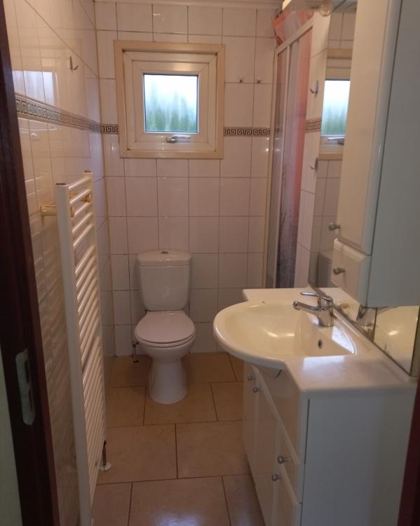 De nette geheel betegelde badkamer is voorzien van een douche, wastafel en radiator. Er is een separaat toilet aanwezig.