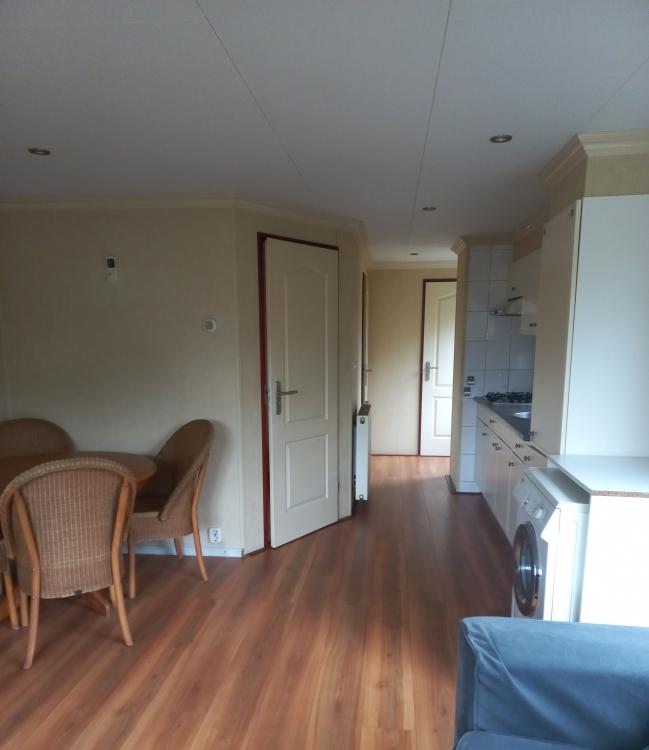 De ruime woonkamer beschikt over een nette laminaatvloer en geniet van veel lichtinval middels de grote raampartij. De woonkamer biedt u toegang middels een deur tot de ruime tuin. Ook is er airco aanwezig in het chalet.